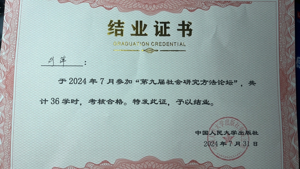 2024年7月28日至8月1日,中国人民大学出版社邀请国内社会研究方法领域的知名专家、学者,于贵州省贵阳市举办了“第九届社会研究方法论坛”。本次论坛共有来自全国来自28个省市,134所院校的240位老师和员工参加,其中线上参会72人。公司公共管理系刘萍老师全程参加了此次会议,积极参与互动,并获得了本次论坛的结业证书。社会研究方法作为发现社会、探究社会的利器,是社会科学研究的重要工具。国内高校 和科研机构对社会研究方法愈发依赖,尤其在新一代信息技术、人工智能快速发展的背景下, 如何面向新情况更好地开展社会研究,更成为广大科研工作者的重要关切。秉承“服务高等 教育事业,服务一线任课教师”的宗旨,为了进一步促进对社会研究方法的交流和研讨,提 升研究者运用社会研究方法的能力与技巧,人大出版社组织了此次论坛。本次会议议程及主讲人情况介绍如下: