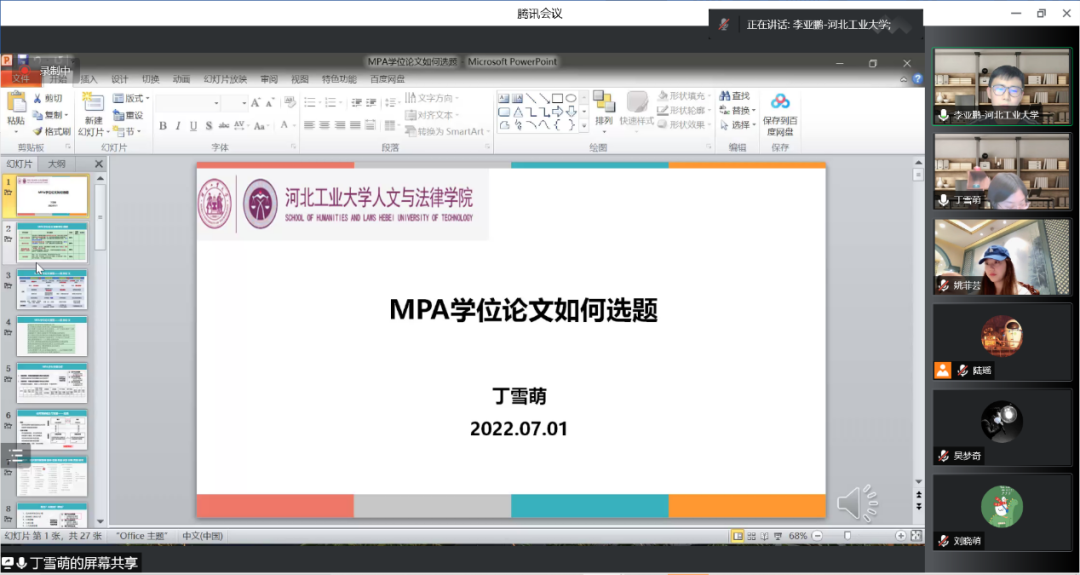 2022年7月1日晚19点,“引航毕业,助力论文”系列活动第一期“研究生论文如何选题”于线上准时召开。本次活动特邀yl88858永利官网丁雪萌老师主讲,MPA教育中心副主任李亚鹏老师主持,MPA同学共同参与。