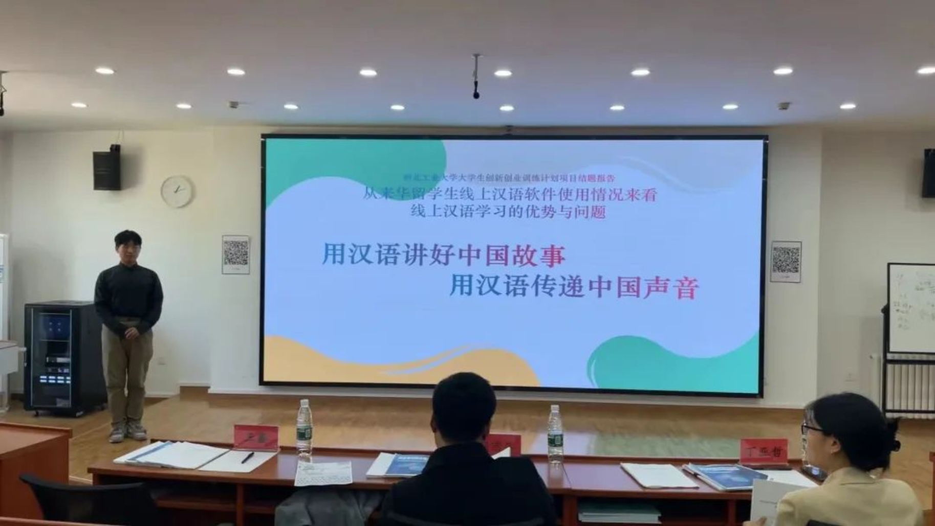 第二支队伍就来华职工汉语学习方面来阐述项目内容,该队伍立足技术基础,从线上汉语教学的角度出发,以天津高校的职工为典型样本,切实反映互联网时代下职工学习汉语的方式,为对外汉语教育进一步拓宽途径,评委老师也对该项目的用户体验及对教师的普及方面进行指导;