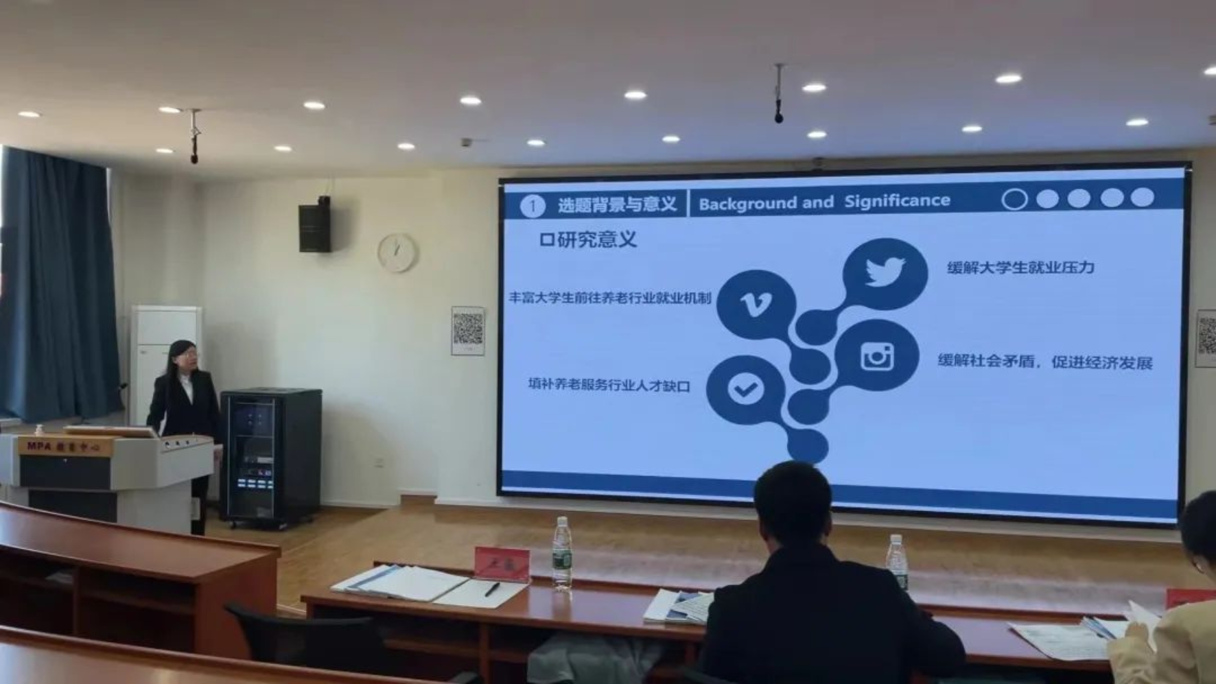 第一支队伍专注社会养老方面,提出“老员工养老行业就业机制及社区养老模式创新研究”项目,通过分析当代老员工的就业去向及对待养老行业的看法以及社区养老模式的设想等方面来阐述项目意义,其项目内涵获得评委老师的肯定;