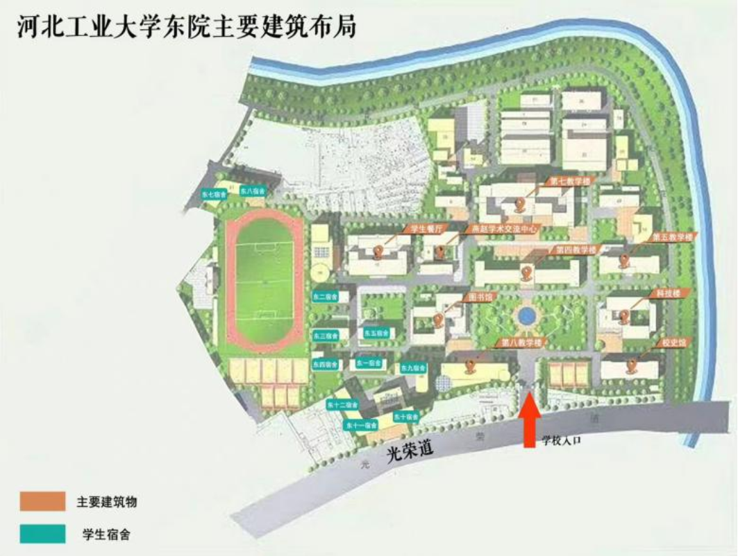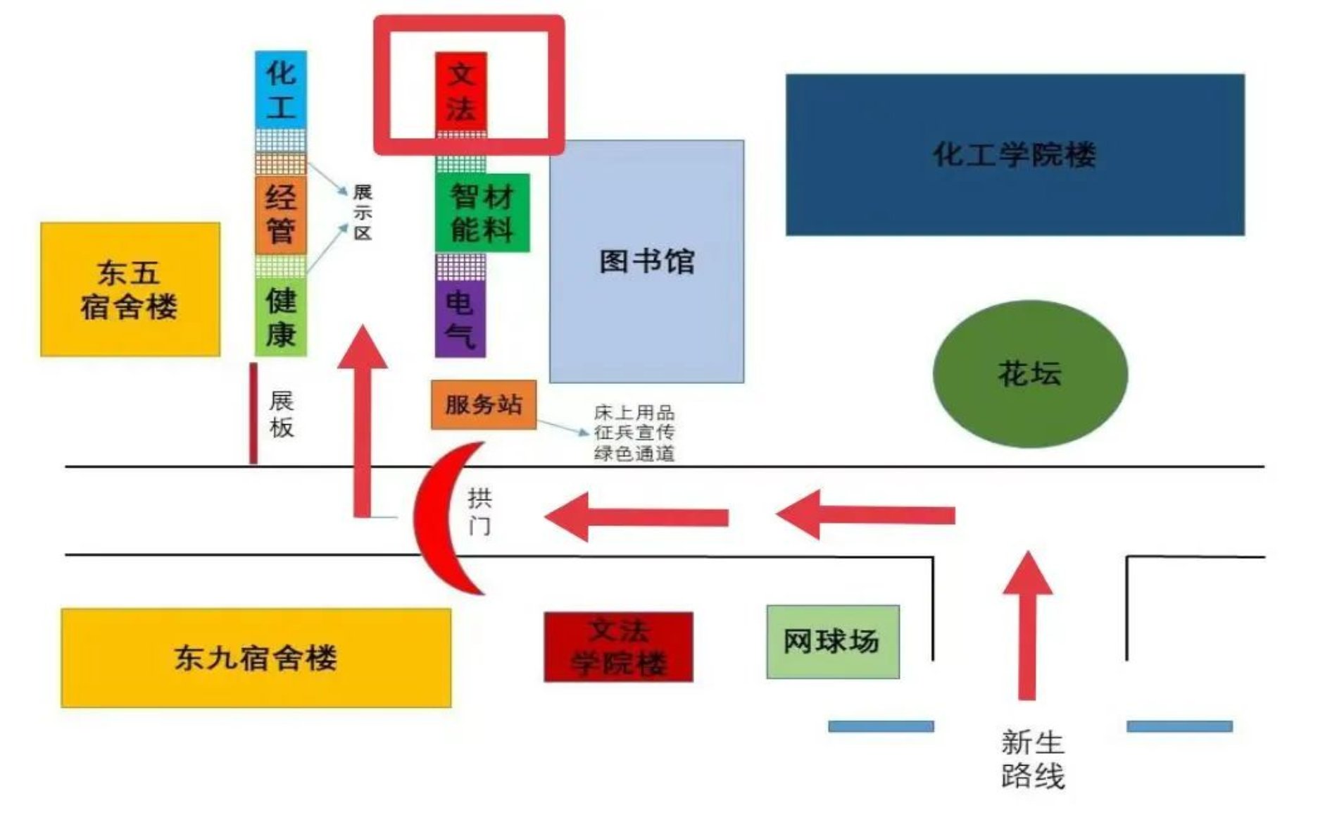 新生们进入东院校门口后,向左方向拐弯直走便可看到图书馆,随后到达位于图书馆西侧的报道点。新生女生宿舍是东二宿舍,新生男生宿舍是东三宿舍。报到路线图和永利集团官网东院主要建筑布局图如下所示