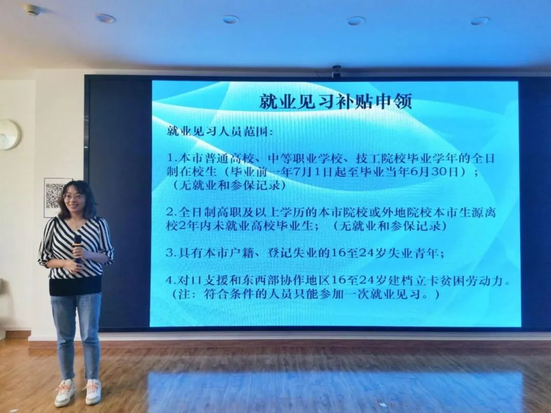 人社局同志们首先为同学们介绍的是“就业见习补贴申领”政策,其中分别介绍了就业见习人员范围、就业见习的优势以及就业见习的工作及待遇。这一部分中,人社局同志重点提醒了同学们在签订合同协议类文件时要细心阅读以避免将来可能遇到的不必要的麻烦。