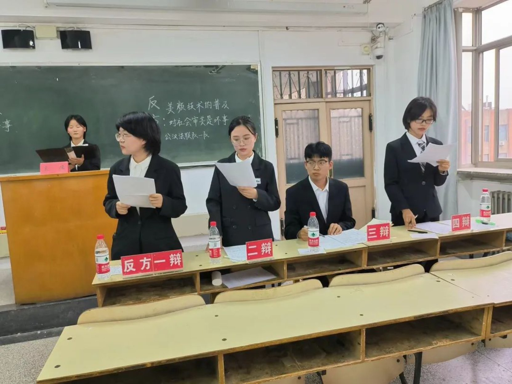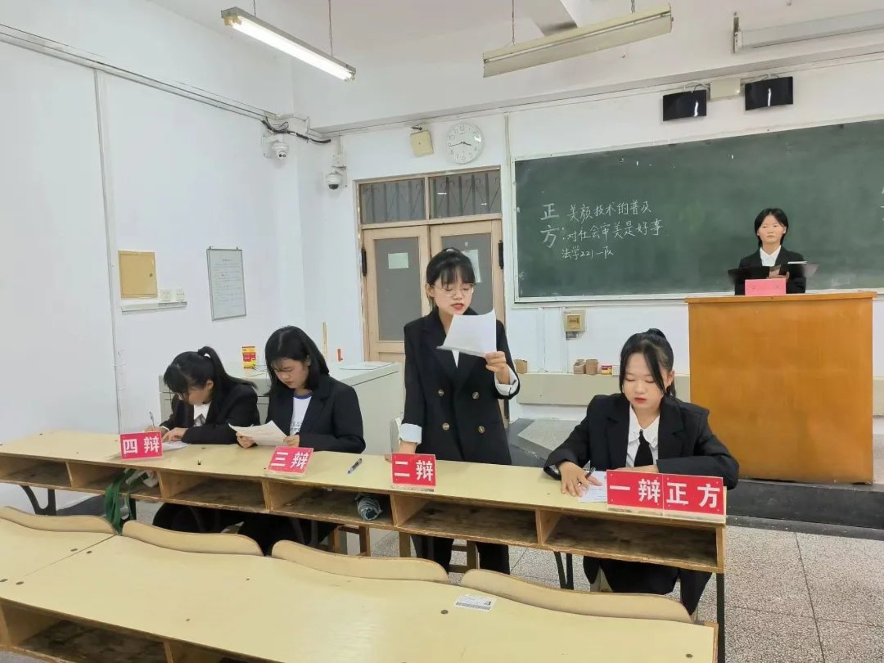 随着现代科技的发展,人们可以借助“美颜相机”等自拍软件满足自己的“爱美之心”,正方和反方围绕“美颜技术的普及对社会审美是好事还是坏事”这一辩题展开辩论。正方认为美颜技术的普及有利于大众的个性化表达,促进了社会审美的多元化,以更低的成本追求美,提高社会审美能力,对社会审美是好事;反方则认为美颜后的自我并不是真实的自我,美颜技术的普及会加剧社会审美的单一化趋势,造成严重的容貌焦虑,对社会审美是坏事。双方皆立论准确,妙语连珠,最终正方更胜一筹,正方二辩姜宁宁被评为“最佳辩手”。