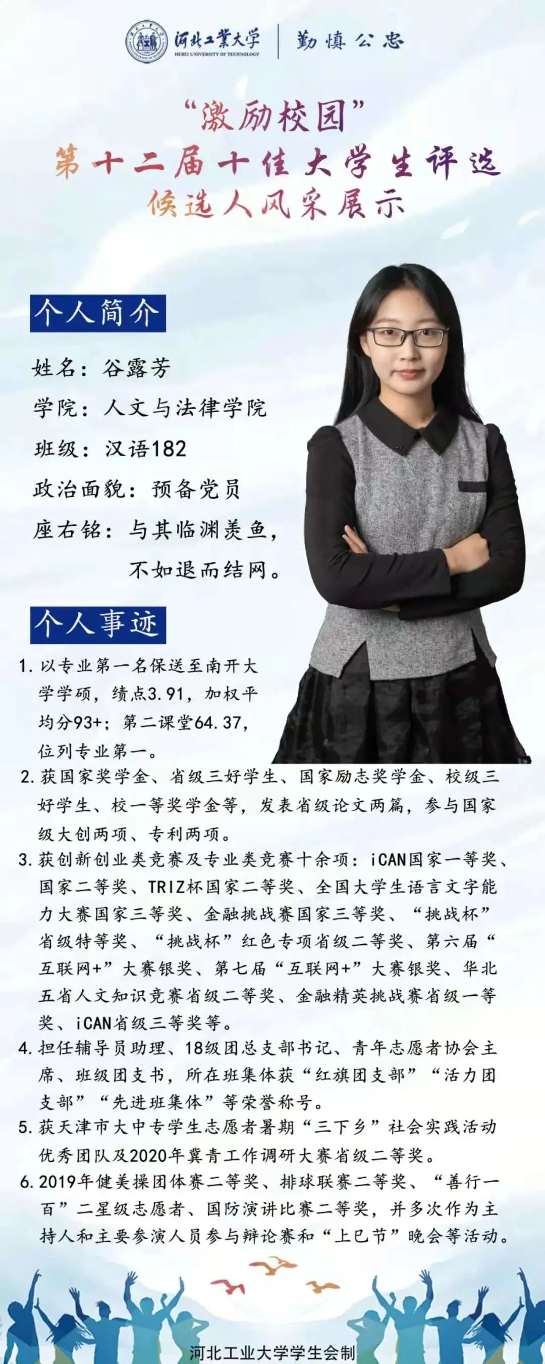 谷露芳是老师的得力助手,也是同学们口中的“万能解忧人”。“与其临渊羡鱼,不如退而结网”是她矢志不渝的初心和座右铭,超强的执行力和一丝不苟的研学态度为她带来了无数名誉与荣耀,而谷露芳始终只是低头做事,保持着一贯谦虚谨慎的品格。她热爱文字,为其痴迷。她并不不执着于成功,只感恩于成长。