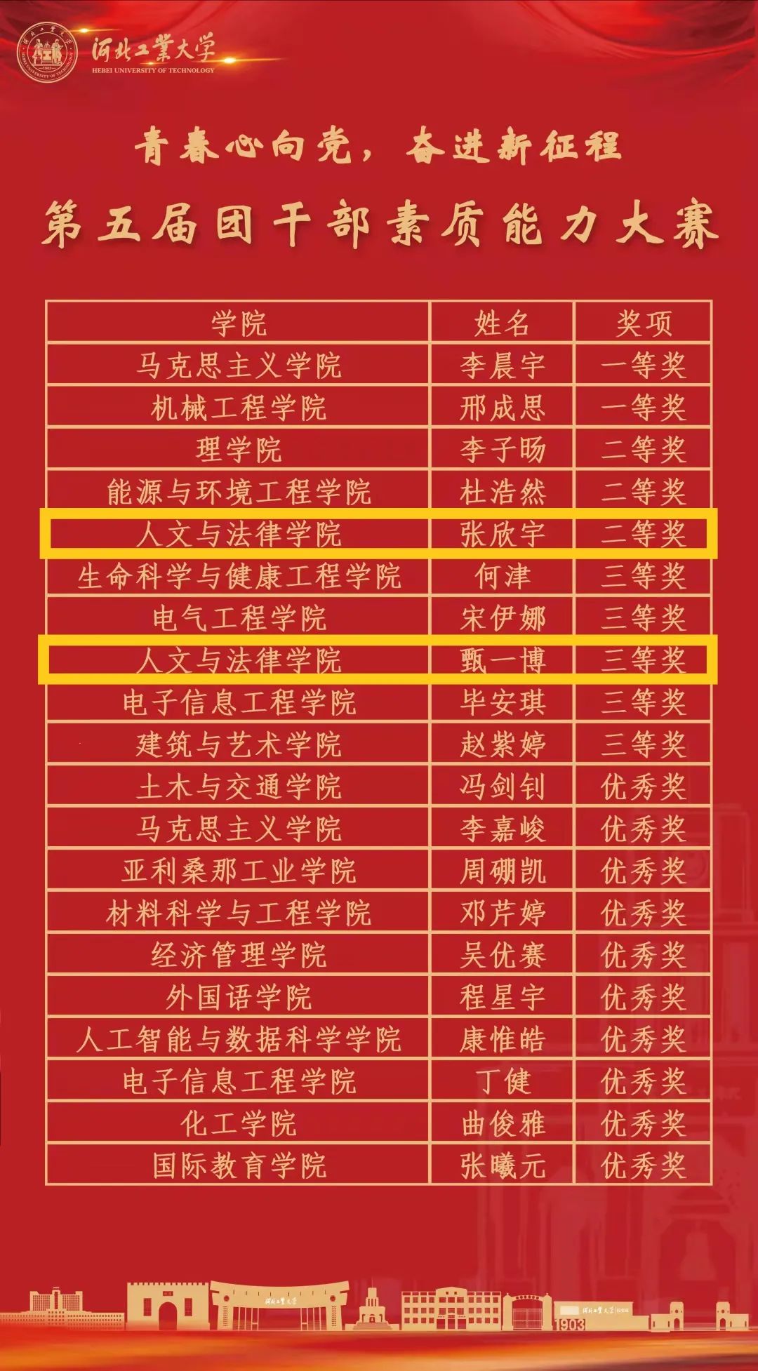 公司张欣宇、甄一博凭借其优异表现在本次团干部素质能力大赛斩获佳绩。两位同学经过层层选拔最终进入决赛,其中,社保201张欣宇同学获得二等奖,公管191甄一博同学获得三等奖,两人均荣获首届“永利集团官网优秀共青团干部”的荣誉称号。
