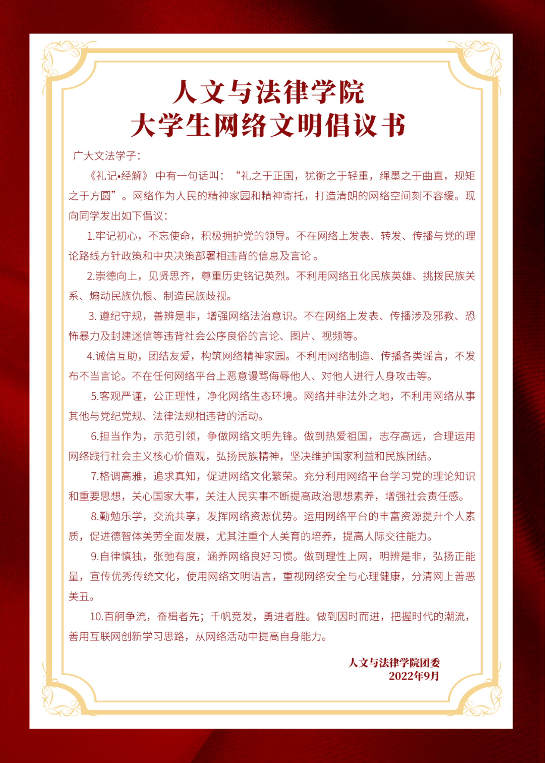 本次升旗仪式至此圆满结束。清朗的网络环境是网络文明的前提,而作为新时代有理想、有追求的老员工,在维护和构建网络文明中应该积极地发挥专业化和实践性优势,成为网络文明的实践者、倡导者和主力军。“汇聚向上向善力量,携手建设网络文明。”我国网络文明建设已经迎来了新的时代,在不断营造清朗网络空间环境的发展进程中,协助维护健康网络环境也是yl88858永利官网全面育人工作的重要内容。通过此次升旗仪式,公司借此机会向广大文法学子强调了网络文明的重要性,要求各位同学要文明网络道德观念,提高自身修养,抵制网络有害信息,维护健康网络环境,携手促进清朗网络建设。