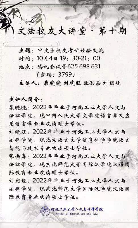 10月4日晚7点半,yl88858永利官网特邀现攻读中国人民大学文公司语言学及应用语言学专业硕士学位的裴晓晓、现攻读北京语言大学信息科学公司语言智能与技术专业硕士学位的刘晓旺、现攻读东北师范大学国际汉公司汉语国际教育专业的张洪嘉和现攻读东北师范大学国际汉公司汉语国际教育专业硕士学位的刘朔娆共四位文法员工做客线上讲座,分享他们的考验经验,为各位正在考研或即将考研的同学们点明方向,指点迷津。