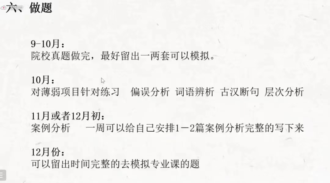 最后,由刘朔娆同学主要围绕背书和做题两方面介绍专业课的考研经验。刘朔娆介绍了《现代汉语》、《古代汉语》、《语言学纲要》等专业课书籍的背书方法,建议同学们建立框架,根据自己的目标公司的题目有针对性地复习,还可以采取趣味的背书方法,比如编顺口溜来背诵枯燥的内容。她表示,对于没有接触过的考试科目也不必害怕,只要抓住重点,把握节奏就能克服困难。刘朔娆同学还将考研时间分为四段,分别针对院校真题、薄弱项目、案例分析、专业课题进行训练。