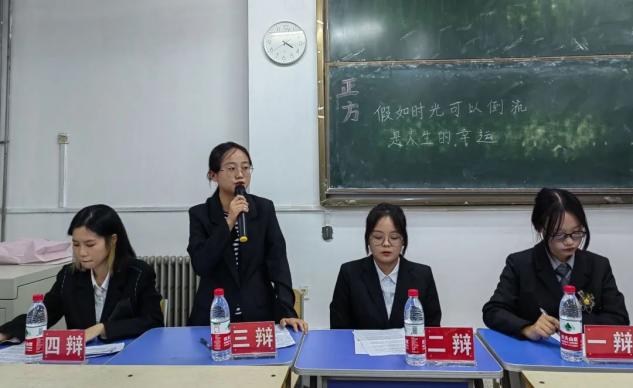 “像每一滴酒回不了最初的葡萄,我回不了年少。”大概每个人都幻想过时光倒流,去改变决定人生走向的某个选择,去收回那句令人伤心的话,去见某个重要人的最后一面。但如果时光可以倒流,真的是人生的幸运吗?正反方对此展开了激烈的辩论。正方辩手持“假如时光可以倒流,是人生的幸运”的观点;而反方辩手则持“假如时光可以倒流,不是人生的幸运”的观点。