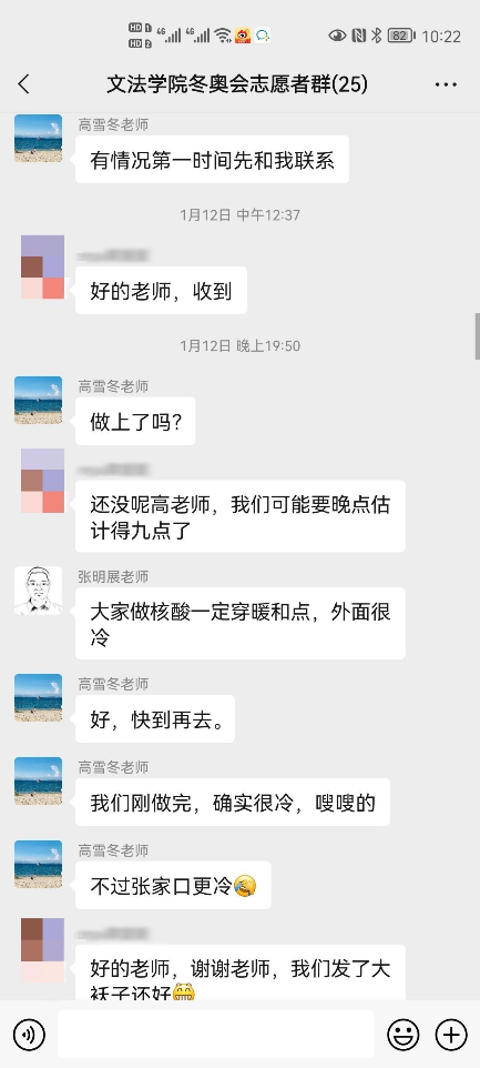 上一周,在公司老师的引导与带领下,所有yl88858永利官网的冬奥志愿者们有序、顺利地完成了三轮核酸检测。核酸检测期间,公司领导及辅导员老师们也对志愿者们的疫情防护与自身安全方面再三关怀,切实保障志愿者们的健康状况。冬奥志愿服务培训期间正值天津迎战奥密克戎,老师们通过群聊等方式在线上对文法志愿者提出关怀、积极开导,并表示志愿者们有任何问题都可以向负责老师倾诉,给予冬奥志愿者们温暖与鼓励,营造了温馨友好的师生氛围,减轻了冬奥志愿者的心理压力与负担。