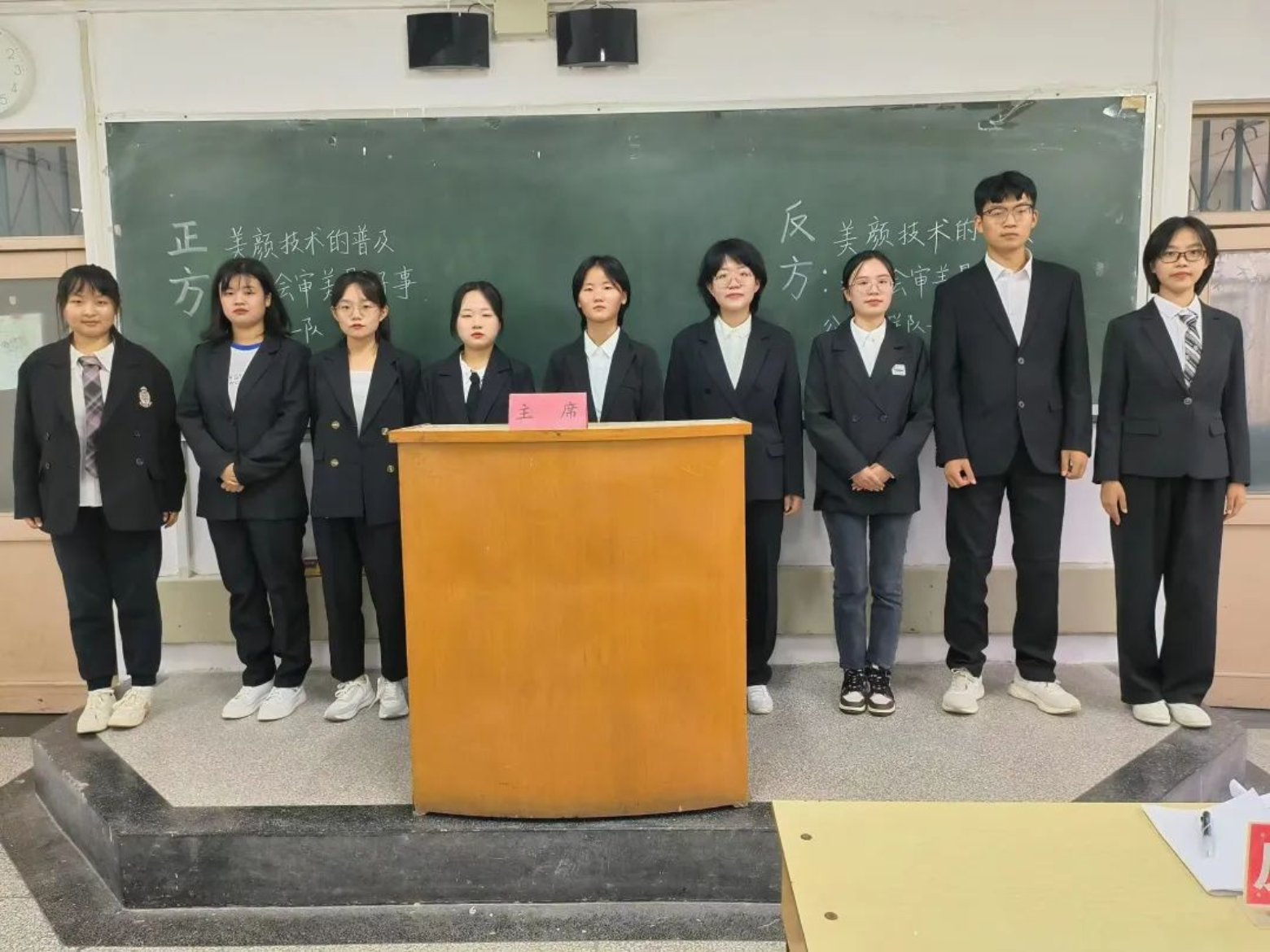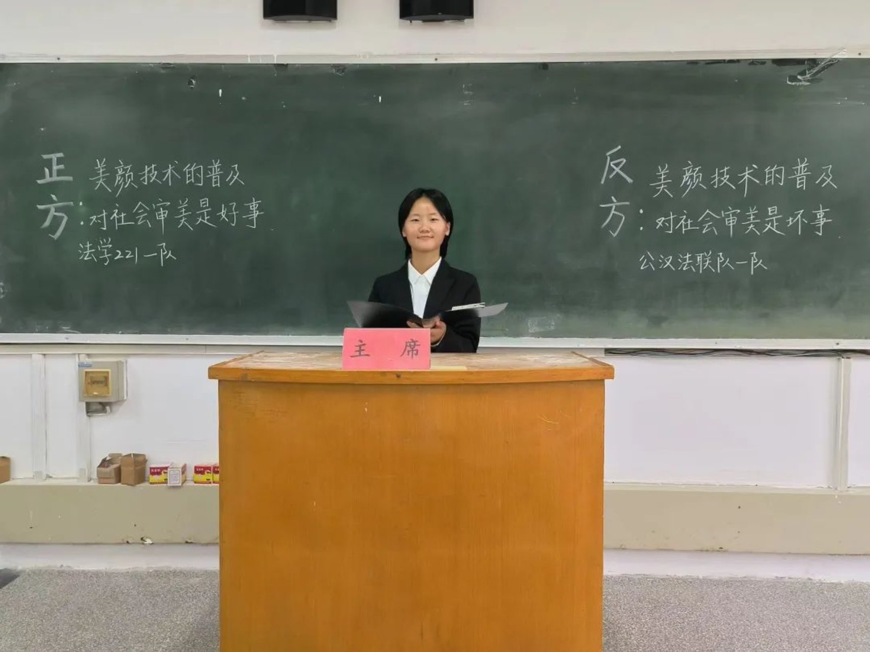 随着现代科技的发展,人们可以借助“美颜相机”等自拍软件满足自己的“爱美之心”,正方和反方围绕“美颜技术的普及对社会审美是好事还是坏事”这一辩题展开辩论。正方认为美颜技术的普及有利于大众的个性化表达,促进了社会审美的多元化,以更低的成本追求美,提高社会审美能力,对社会审美是好事;反方则认为美颜后的自我并不是真实的自我,美颜技术的普及会加剧社会审美的单一化趋势,造成严重的容貌焦虑,对社会审美是坏事。双方皆立论准确,妙语连珠,最终正方更胜一筹,正方二辩姜宁宁被评为“最佳辩手”。