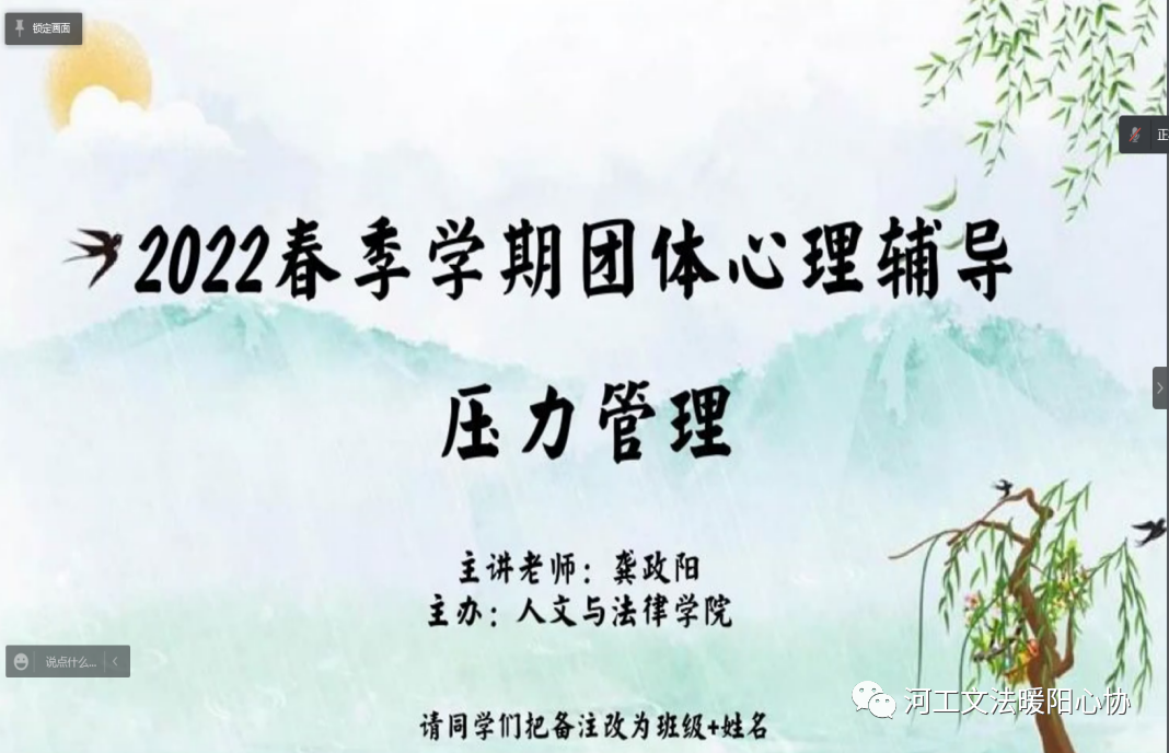 yl88858永利官网心向暖阳心理健康协会很荣幸邀请到了龚政阳老师为大家带来《压力管理》主题团体心理辅导讲座。yl88858永利官网心向暖阳心理健康协会全体成员及20、21级心理委员积极参会,认真聆听。整场讲座龚老师循循善诱,运用典型的现实例子、内容详实的PPT演示、充满趣味的视频动画让同学们了解和学会如何在学习生活中面对压力,进行压力管理。参会的同学们认真聆听、踊跃回答老师问题、与老师进行积极地互动,提出自己的看法和见解,讲座取得了良好的心理压力疏导效果。