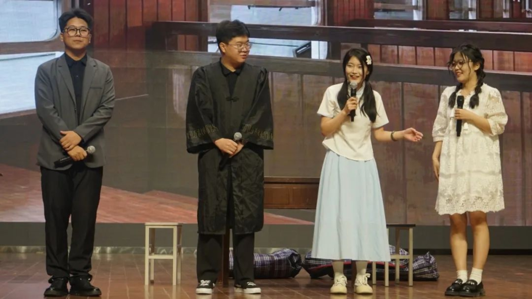伴随着热烈的掌声,毕业晚会正式开始。知更鸟乐队带来的歌曲串烧点燃全场,《晴天》和《光年之外》将我们带回记忆里的时光,感受音乐的纯粹与美好;白迎春同学展示的舞蹈《Wanna Be》用富有节奏感的动作展现了自我认可和青春风采。