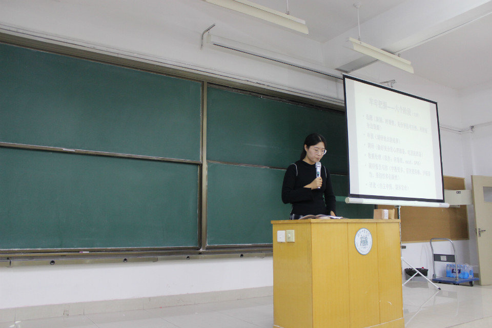 “大学离不开两个字,那就是学习”,被保送至南开大学的王滢学姐主要为我们介绍保研前的准备,强调了转变学习方法、尽快适应老员工活的重要性。“绳锯木断,水滴石穿。日常积累必不可少”。学姐提到,良好的宿舍学习氛围促进了她的进步,并鼓励同学们学会合作学习。王滢学姐针对不同年级提供了不同的建议,把多年的学习生活经验分享给了学弟学妹。