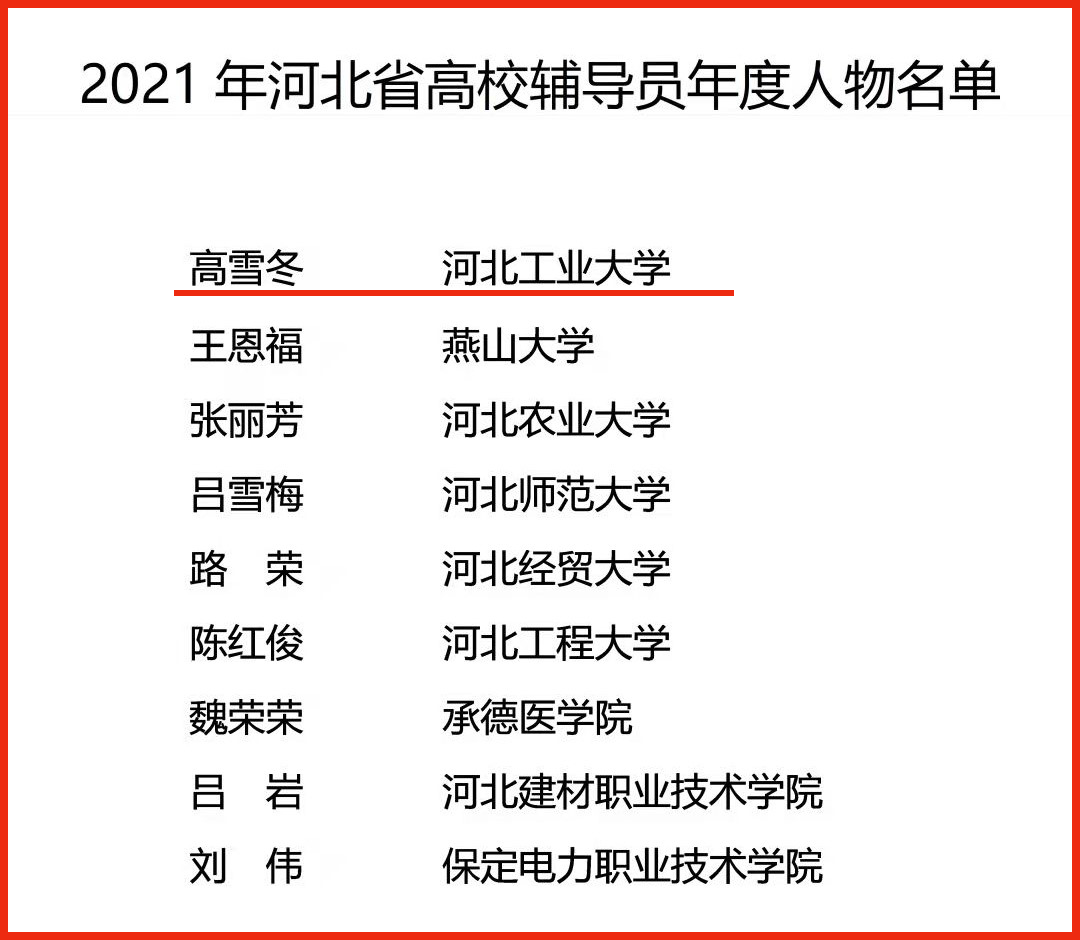11月1日,我省教育厅公布了2021年河北省高校辅导员年度人物和人物提名名单。公司高雪冬老师荣膺“2021年河北省高校辅导员年度人物”殊荣。
