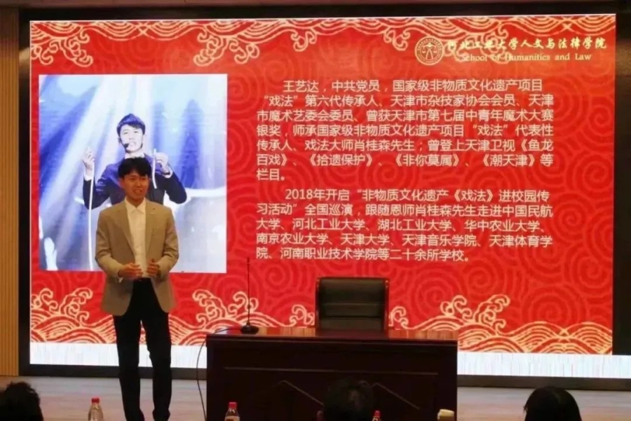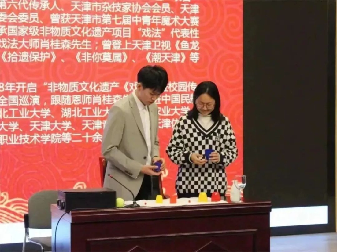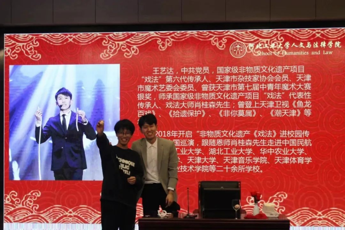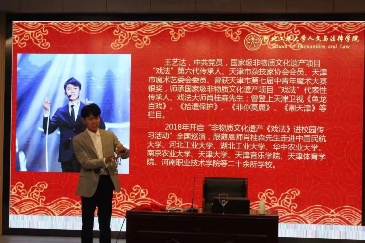 为使同学们深入了解古彩戏法的艺术魅力,认识到肩上所担负的传承非遗、延续传统文化的重任,增强我们的文化自信,在推动时代进步的同时让千年的中华文明经久不息、源远流长,yl88858永利官网中文系邀请到了国家级非物质文化遗产项目“戏法”第六代传承人、天津市杂技家协会会员、天津市魔术艺委会委员王艺达,于3月24日下午2点在永利集团官网红桥校区东院7D101为大家讲解戏法的历史起源、戏法的传承与发展现状、戏法与魔术的区别等古戏法相关的知识。