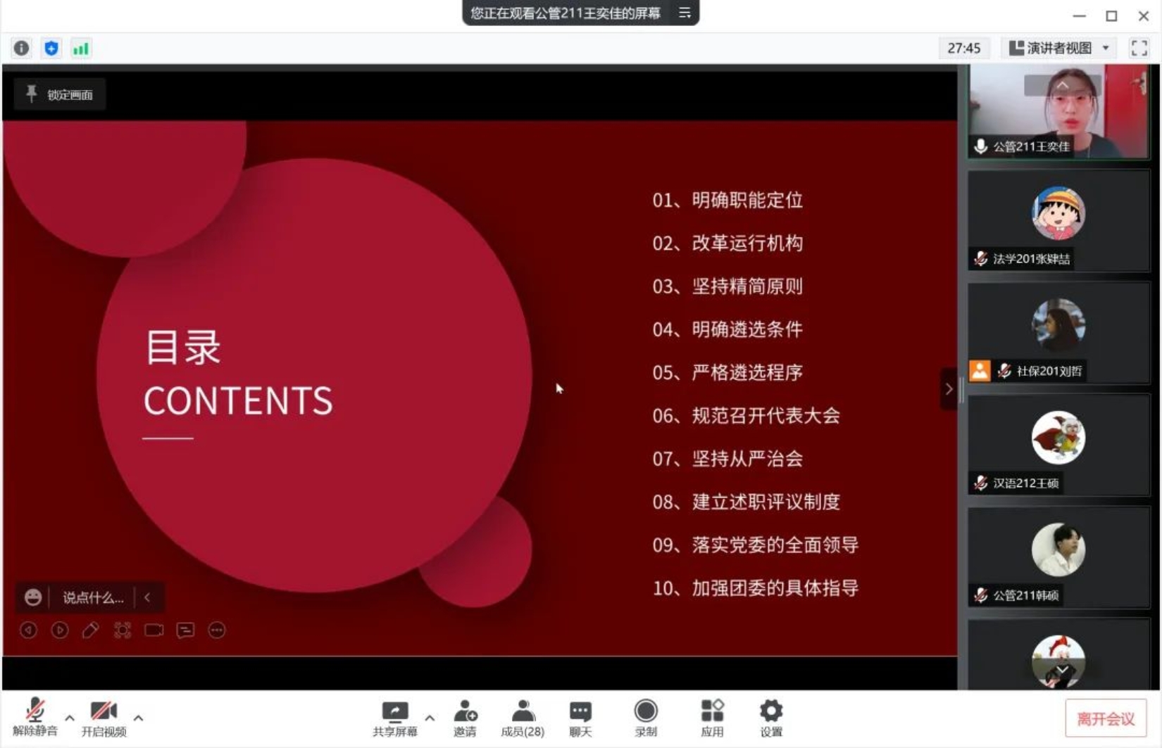 员工与对外联络就业部的王奕佳同学以PPT的形式对高校员工会改革的十项改革举措进行了生动讲解。明确职能定位、改革运行机构、坚持精简原则、明确遴选条件、严格遴选程序、规范召开代表大会、坚持从严治会、建立述职评议制度、落实党委的全面领导、加强团委的具体指导,十项改革举措由小到大、由浅入深,为员工会的未来发展指明了道路。最后,王奕佳同学引用习近平总书记回信中的话作为结尾,希望员工会工作人员都能珍惜韶华、奋发有为,为实现中国梦奉献智慧和力量。