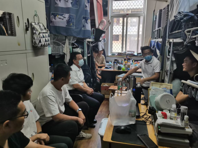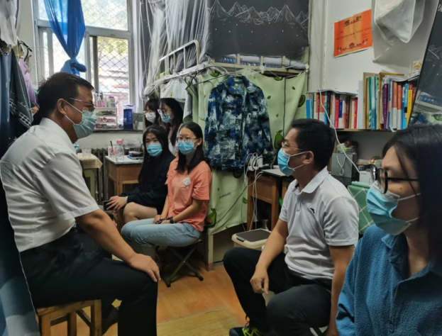 在男生宿舍中,一位来自内蒙古、喜爱运动的男生兴奋地与老师们交谈,讲述自己今年开学后的感受:北院环境改善了很多,操场的灯亮起来了,新篮球场也盖起来了,晚上运动的方式又多了很多。老师经常来看望我们,同学们也很和善,期待疫情早日结束!听到这些话,老师们叮嘱同学们要快速适应大三的学习节奏,同时也要劳逸结合,保证身体健康。