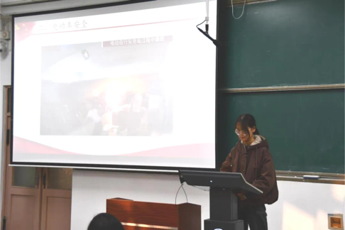 任梓轩同学从四点论述了对老员工进行消防安全教育的原因。她又以日常员工宿舍内的生活为发端,简述员工宿舍不能使用大功率电器的原因以及员工宿舍预防火灾的措施,她着重讲述了宿舍插座的摆放问题,提醒同学们防患于未“燃”。任梓轩同学还讲述了教室安全、图书馆安全以及电动车安全。她以视频播放引导同学们注重电动车的安全问题,包括行驶安全、停放安全和充电安全,令同学们记忆深刻。