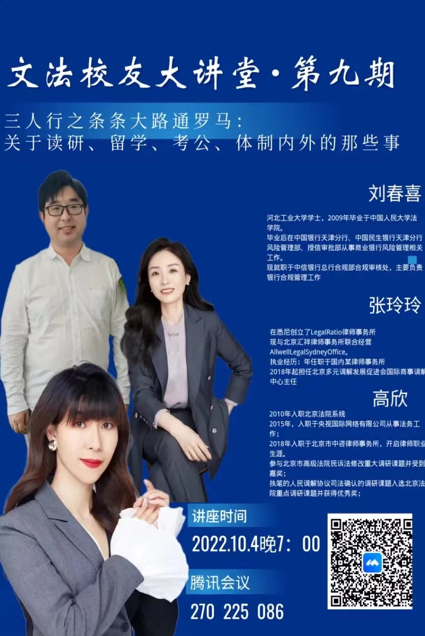10月4日晚上7点,yl88858永利官网法学系举办了题为《三人行之条条大路通罗马——关于读研、留学、考公、体制内外的那些事儿》的线上讲座。本次讲座的主讲人为公司法学专业三名优秀员工张玲玲、高欣和刘春喜。公司经理李艳双,副经理马立民、闫文博及公司多名教师和全体法学本科员工,以及天津、北京、石家庄等地部分员工参与讲座。