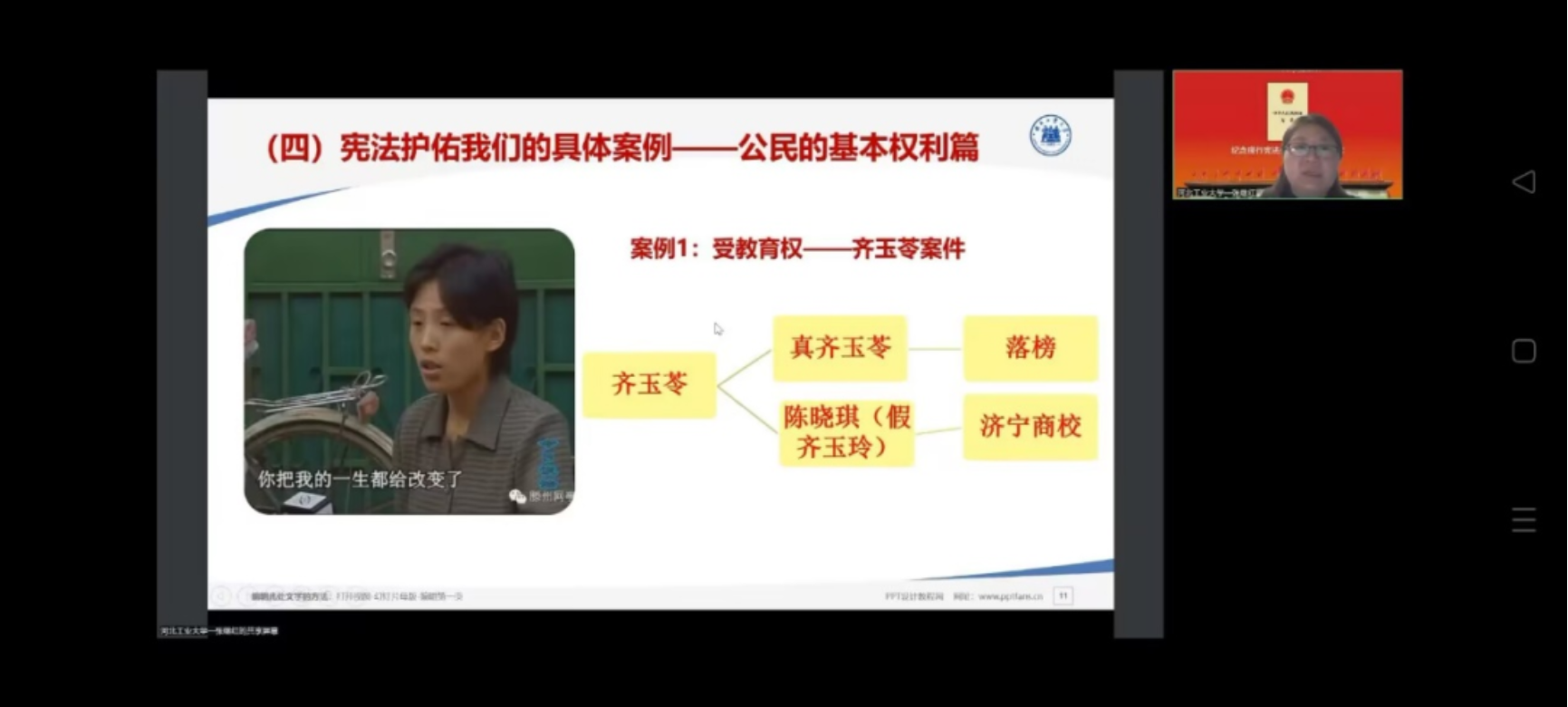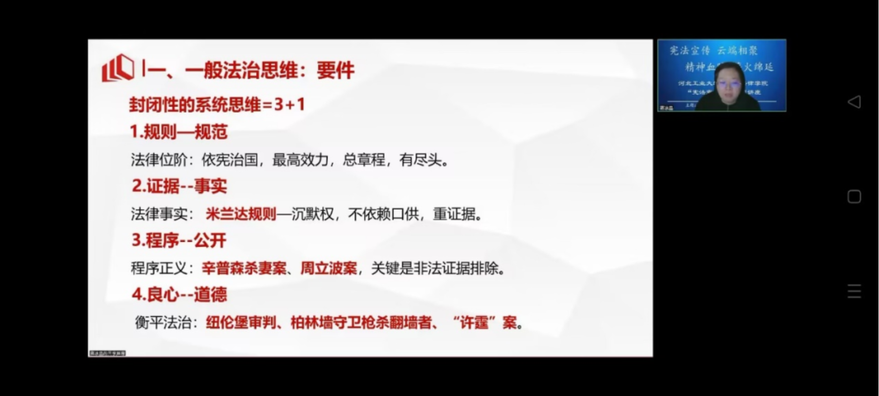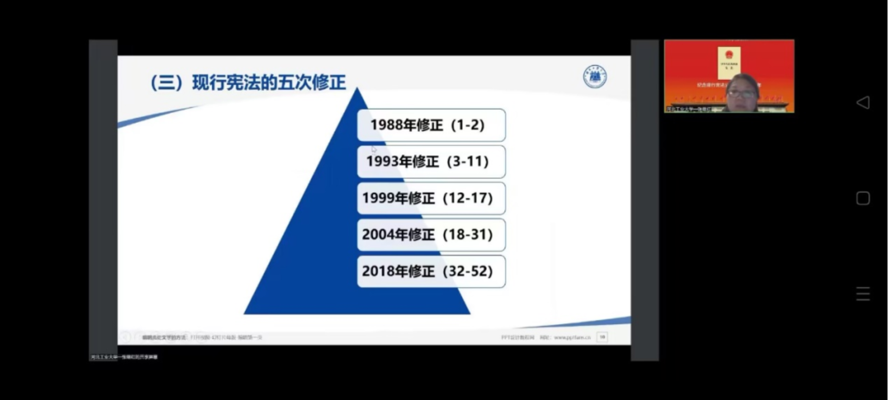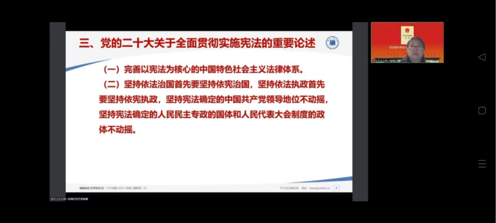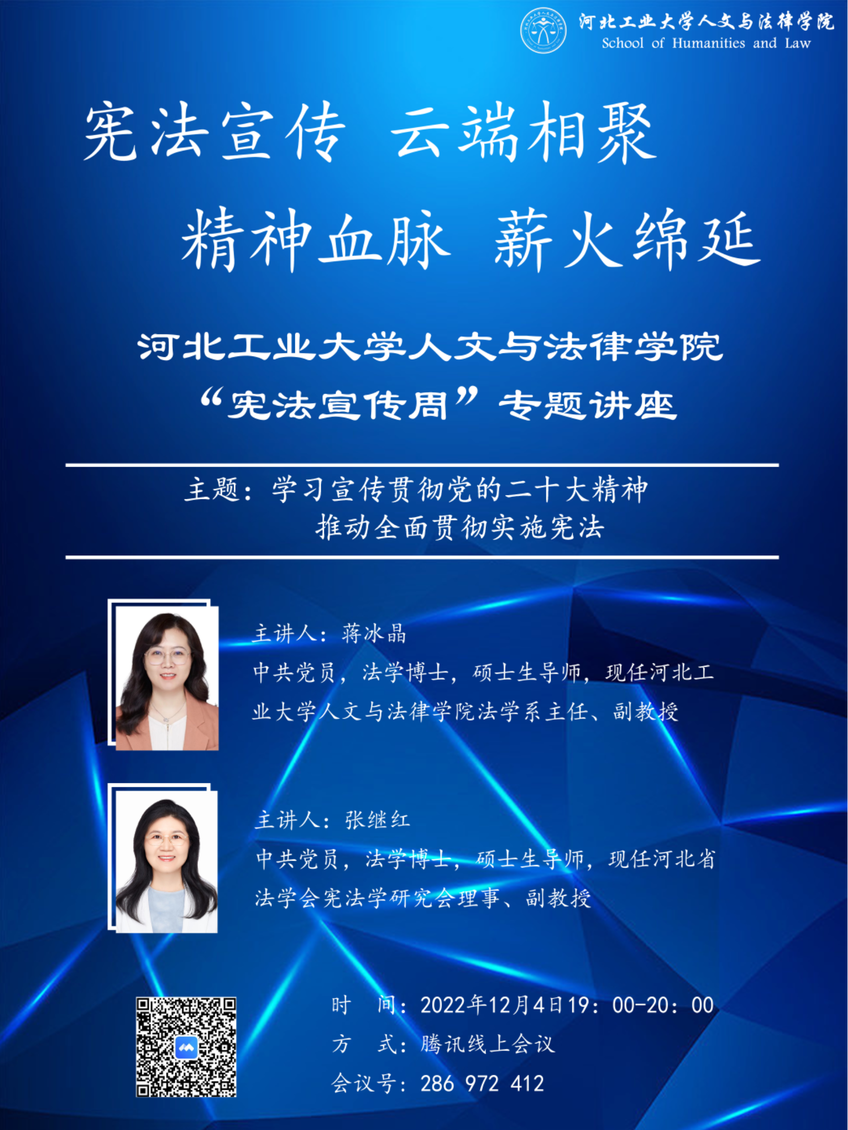 为了让同学们更深入地学习宪法,yl88858永利官网在12月4日晚上7点至8点举办了“宪法宣传,云端相聚,精神血脉,心火绵延”宪法宣传讲座,由蒋冰晶老师和张继红老师担任主讲人。两位老师围绕着学习宣传党的二十大精神、习近平法治思想、关于保障公民权利和规范国家权力的具体事例,以及法治思维、法治思想等内容向参会的同学介绍了关于宪法的知识。