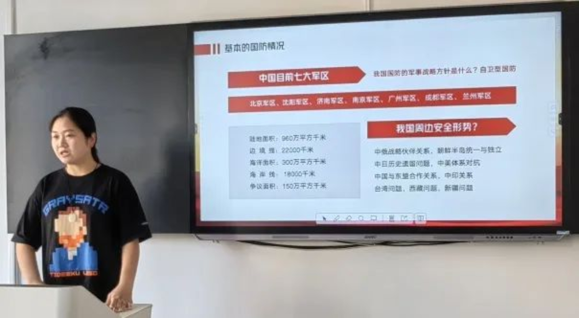 在宣讲的最后,王雨同学对本次国防宣讲进行了总结,她认为关于国防的各种活动可以让我们对国家的历史有一个更加清楚的认知,从而产生更加浓厚的国家自信,希望同学们能够积极参军入伍,为国家国防事业做出贡献。