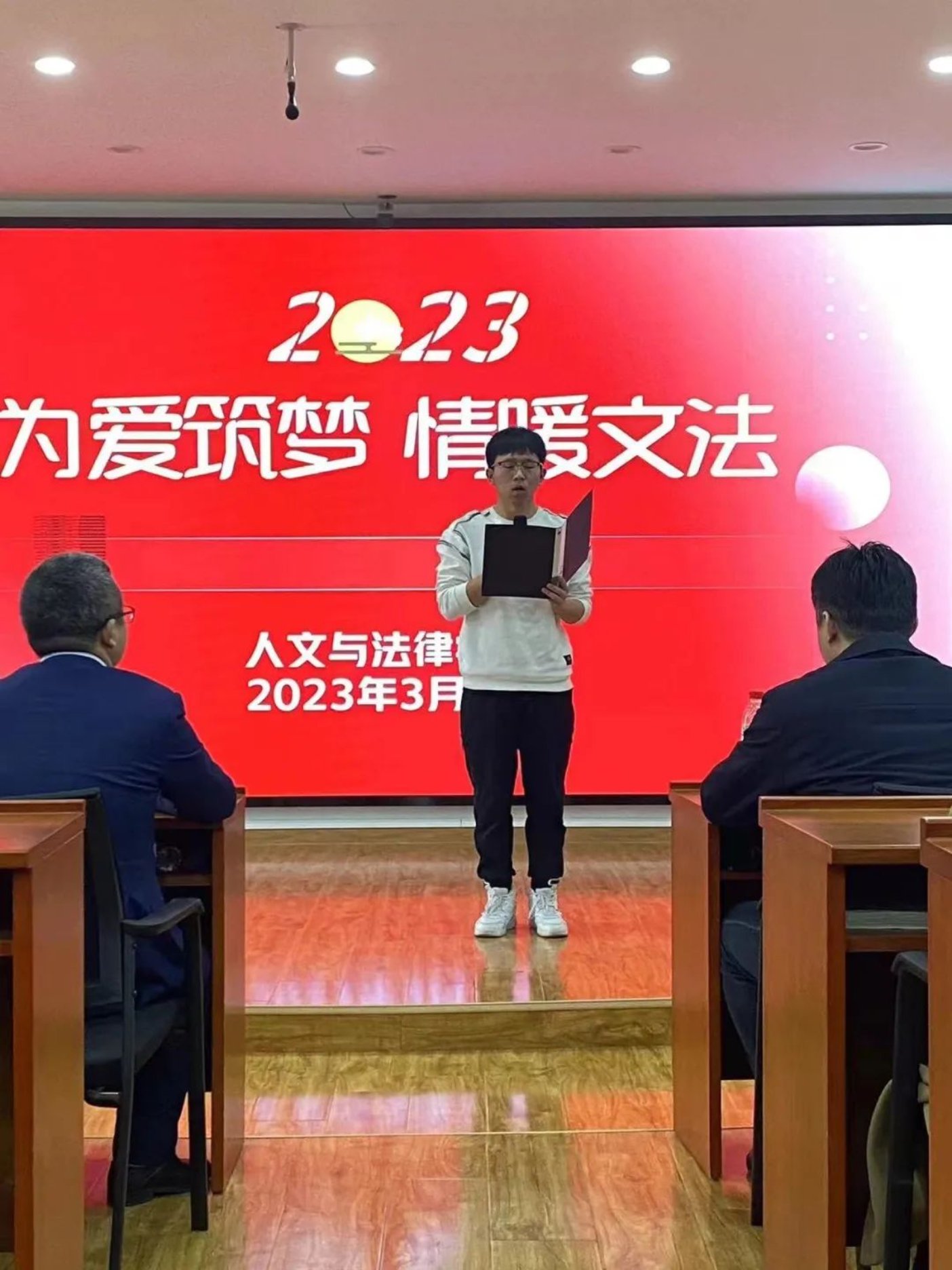 周杰同学作为员工代表,对河北省法学会和所有关心员工成长的领导、老师表达了最衷心的感谢和最崇高的敬意。周杰同学表示,“自古英雄多磨难,历来纨绔少伟男。困难不是我们的障碍,而是我们的动力。贫困虽然不是我们的选择,但它也绝不是我们选择懦弱、选择退却的借口。”他呼吁同学们坚持不懈、积极乐观地面对学习和生活,用一颗感恩的心去生活每一天,并尽己所能帮助他人,将爱传递和延续下去。顽强拼搏,砥砺奋进。坚持永不言败的信念让前行的脚步更加坚定,坚持踏实勤奋的学习让进步更加显著,坚持平实严谨的作风让道路在脚下无限延伸。