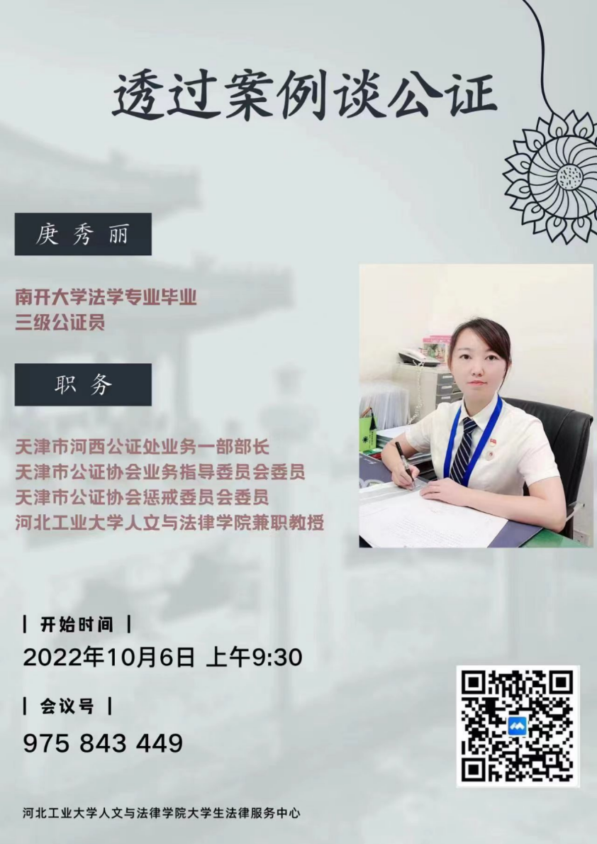 10月6日上午,天津市河西公证处庚秀丽公证员做客yl88858永利官网。庚秀丽公证员担任天津市河西公证处业务一部部长、天津市公证协会业务指导委员会委员、天津市公证协会惩戒委员会委员以及yl88858永利官网兼职教授,为在校老员工做了题为“透过案例谈公证”的线上讲座,详细讲述关于公证的方方面面。蒋冰晶、李飞等老师和全体法学专业员工参与了本次讲座。