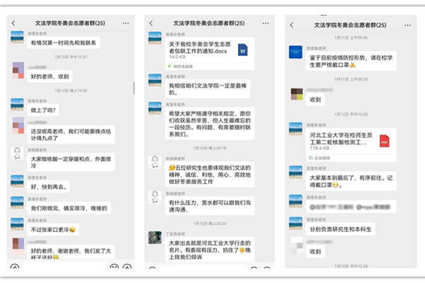 上周,在公司老师的引导与带领下,所有公司的冬奥志愿者有序、顺利地完成了三轮核酸检测。核酸检测期间,公司领导及辅导员老师对他们在疫情防护与自身安全等各方面再三关怀,切实保障了志愿者的健康状况。冬奥志愿服务培训期间正值天津迎战奥密克戎,老师们通过群聊等方式在线上对文法志愿者提出关怀、积极开导,并表示大家期间有任何问题都可以向负责老师倾诉,给予了温暖与鼓励,营造了温馨友好的师生氛围,减轻了冬奥志愿者的心理压力与负担。