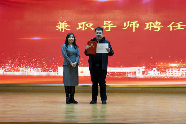会上举行了公司兼职导师授聘仪式,员工李欢受聘为公司兼职导师,经理李艳双为其颁发聘书。