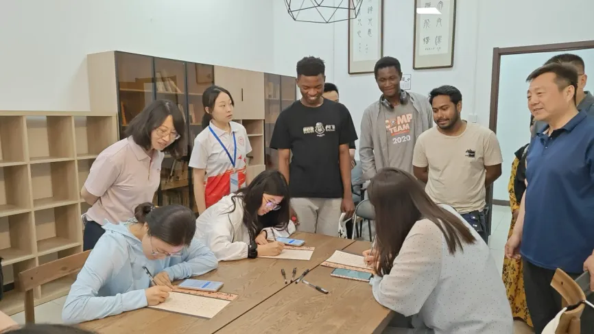 活动现场,中外学子以书法为纽带,展开跨文化对话。职工们好奇地执起毛笔执笔临帖,在横竖撇捺间感受汉字的风骨;中国员工则用英语娓娓道来,讲述传统艺术背后承载的东方智慧——文化交融的种子在此生根发芽。